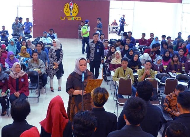 Bupati Cellica saat melakukan prosesi pelantikan IMAKA, di Aula Universitas Negeri Singaperbangsa Karawang (Unsika), Kamis pagi (24/1/2019).