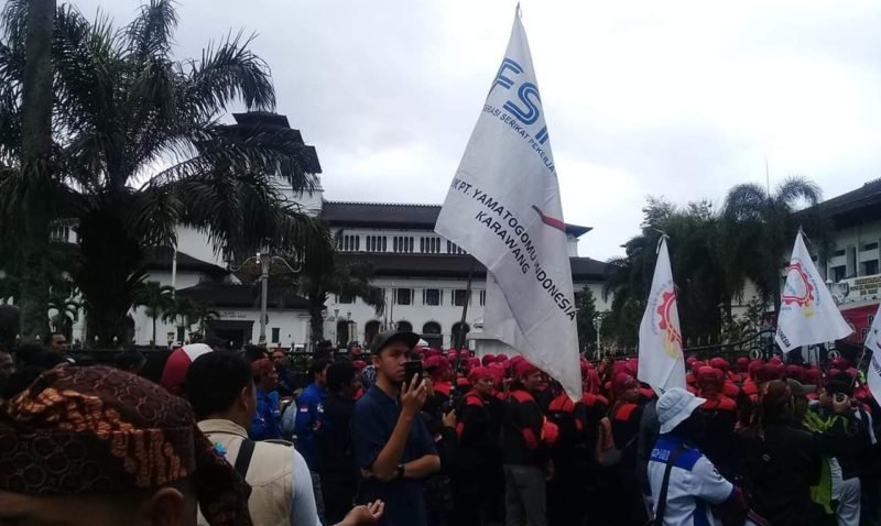 BaskomNews.com – Ribuan buruh yang tergabung dalam Federasi Serikat Pekerja Metal Indonesia (FSPMI) Kabupaten Bekasi, melakukan aksi demonstrasi besar-besaran di Gedung Sate Bandung, Rabu (31/1/2019).