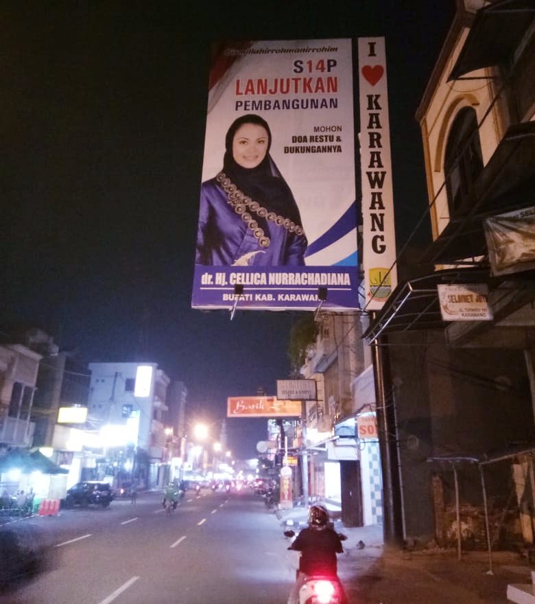 “Bismillahirrahmanirrohim, S14P LANJUTKAN PEMBANGUNAN. MOHON DOA RESTU & DUKUNGANNYA. I Love Karawang,” tulis dalam pesan baliho Cellica Nurrachadiana yang memakai logo Pemda Karawang tersebut.