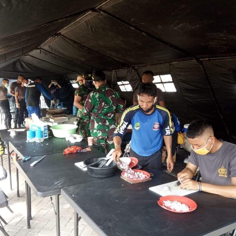 BaskomNews.com – Polres Karawang bekerja sama dengan TNI Kodim 0604 dan Pemerintah Kabupaten Karawang mendirikan dapur umum untuk menyiapkan makanan bagi masyarakat yang terdampak pandemi virus corona atau Covid-19, di Markas Polres Karawang, Kamis (16/4/2020).