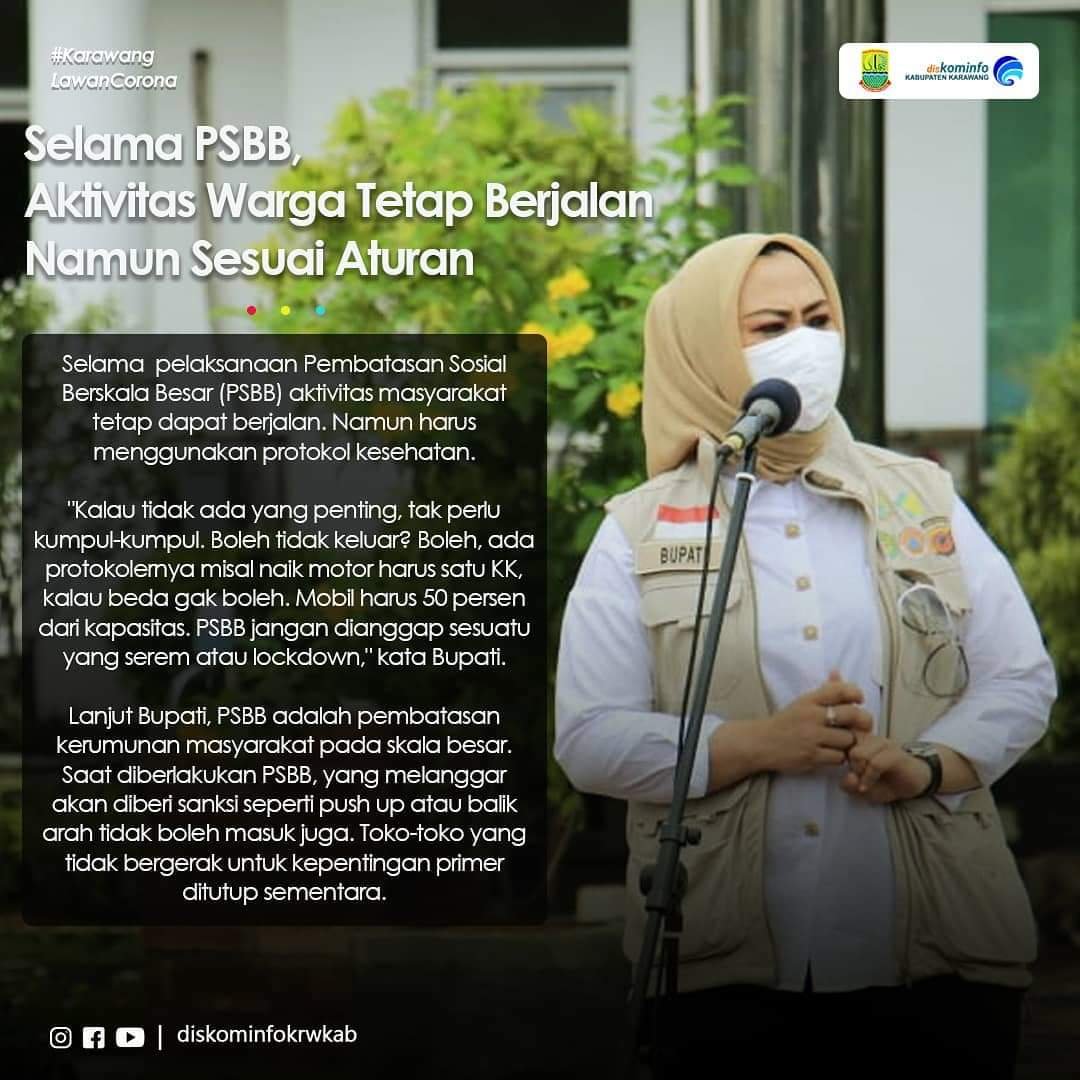 BaskomNews.com – Bupati Karawang, dr. Hj. Cellica Nurrachadiana mengatakan, selama pelaksanaan Pembatasan Sosial Berskala Besar (PSBB) aktivitas masyarakat tetap dapat berjalan. Namun harus menggunakan protokol kesehatan.