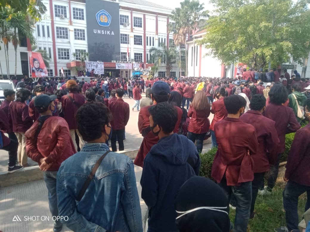 Massa aksi mahasiswa yang dikomandoi Badan Eksekutif Mahasiswa (BEM) dari berbagai fakultas ini memprotes kebijakan rekor baru Unsika, Prof. Sri Mulyani yang dinilai telah mencekik.
