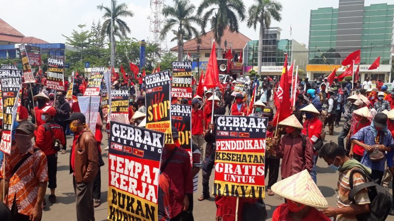 Dalam orasinya, Sekretaris Umum SEPETAK, Engkos Koswara menyampaikan, di masa pandemi Covid-19 ini sedang terjadi penindasan kaum buruh di pabrik-pabrik. Yaitu dimana kaum buruh ‘dirumahkah’ tanpa mendapatkan upah. Tak jarang dari kaum buruh yang langsung di-PHK sepihak.