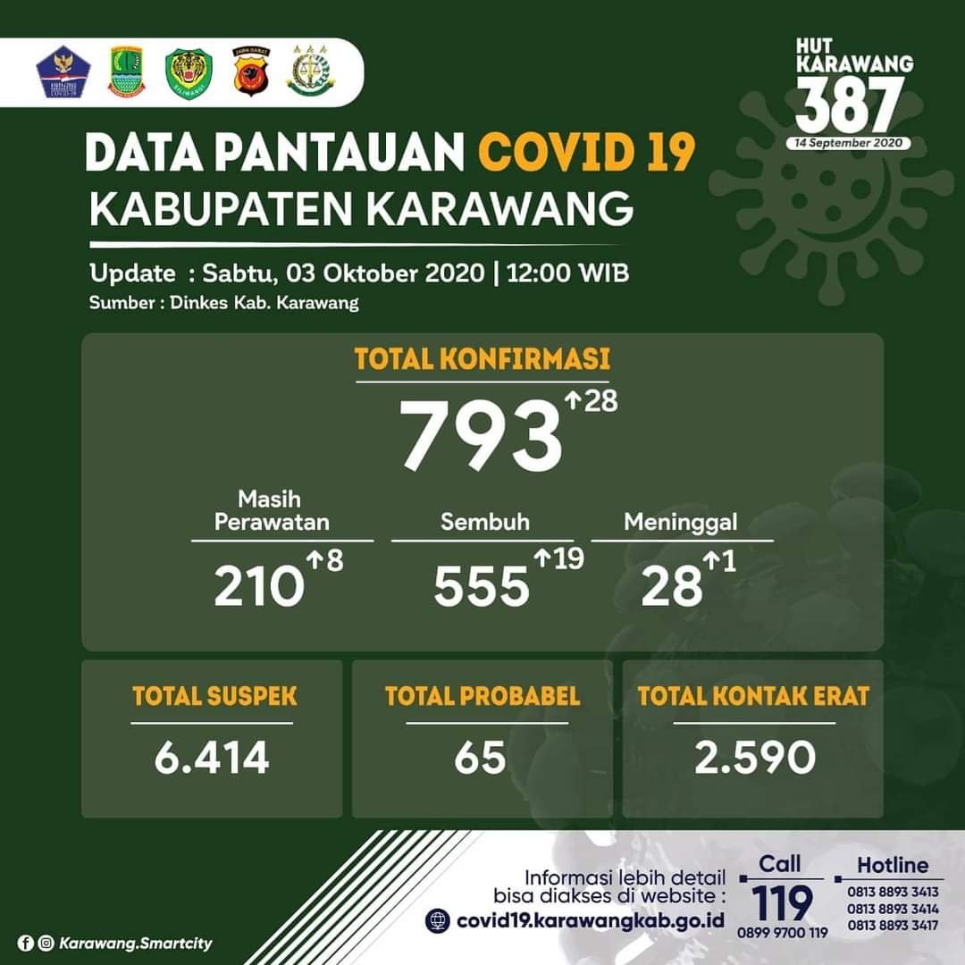 BaskomNews.com – Sempat turun, kasus penularan virus corona di Kabupaten Karawang kembali meningkat. Sabtu (3/10/2020), Gugus tugas percepatan penanganan (GTPP) Kabupaten Karawang kembali mencatat kasus terkonfirmasi virus corona di Karawang yang cukup tinggi, yakni sebanyak 28 orang.