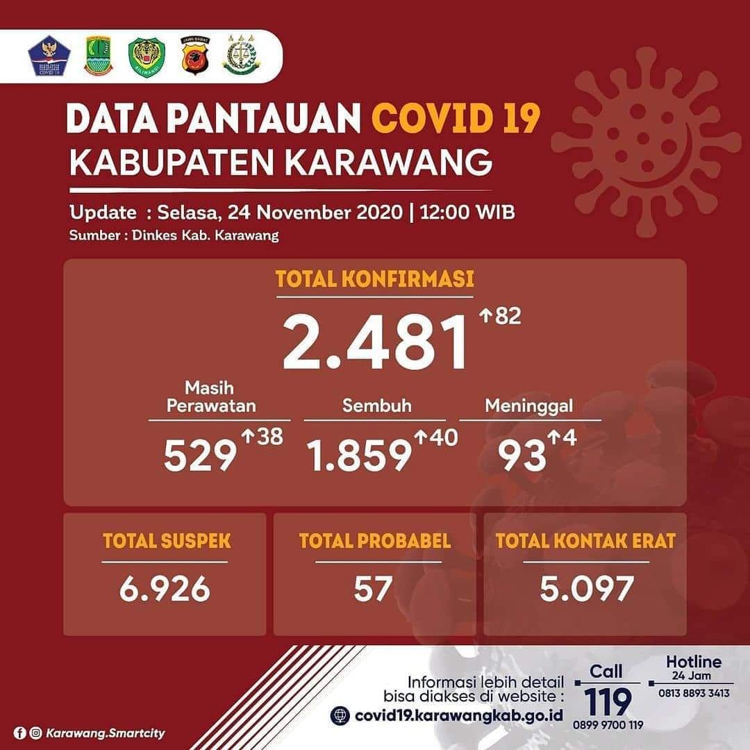 BaskomNews.com – Kasus terkonfirmasi virus corona di Karawang bertambah sebanyak 82 orang pada Selasa, 24 November 2020. Sementara, jumlah pasien terkonfirmasi virus corona di Karawang berjumlah sebanyak 529 orang.