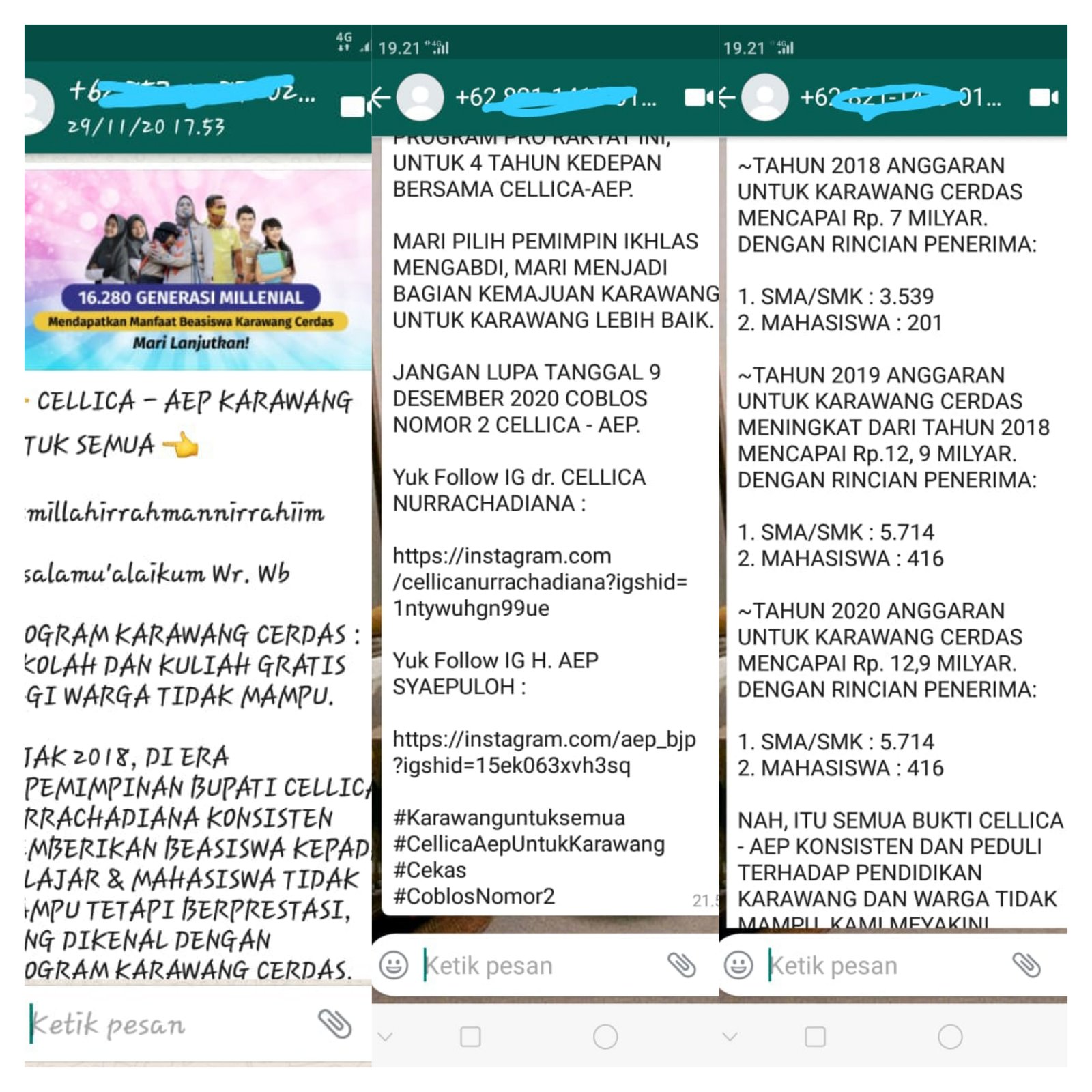 “Jangan lupa tanggal 9 Desember 2020 coblos Nomor 2 Cellica-Aep,” demikian bunyi pesan WA yang mempolitisir program beasiswa Karawang Cerdas.