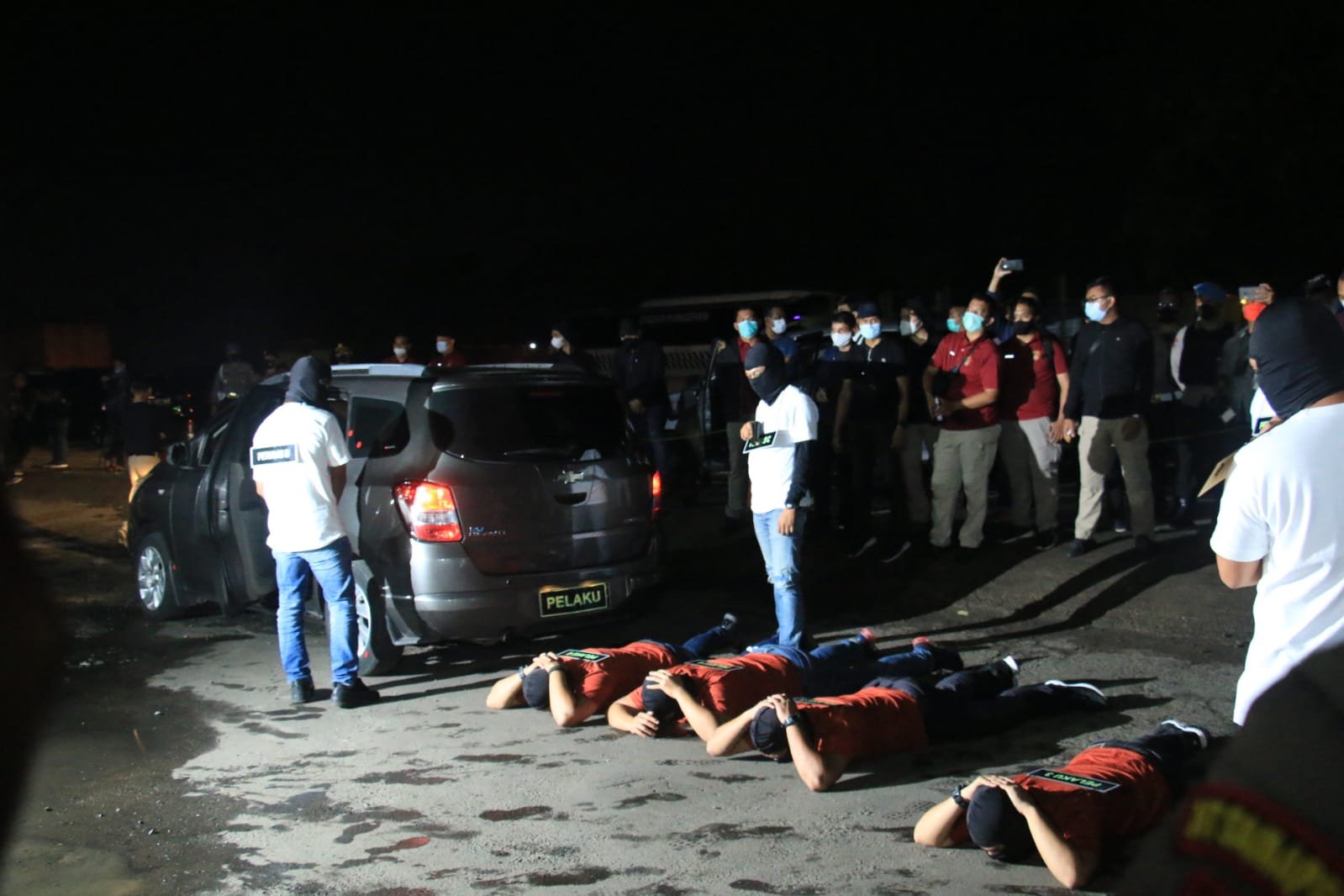 Adapun barang bukti yang dihadirkan pada rekonstruksi, diantaranya dua unit mobil anggota, satu unit mobil tersangka, enam pasang pakaian tersangka, senjata tajam dan dua senjata api rakitan peluru 9 MM.
