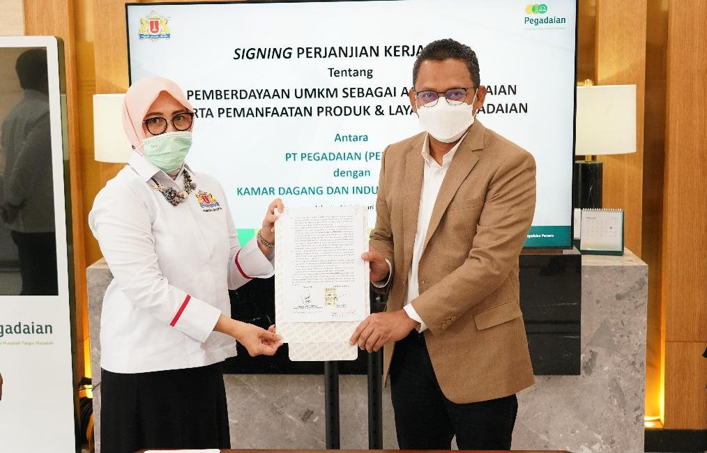 Kerja sama ini ditandai dengan penandatanganan Perjanjian Kerja Sama (PKS) antara Direktur Jaringan, Operasi dan Penjualan PT Pegadaian (Persero), Damar Latri Setiawan dengan Ketua Umum Kadin DKI Jakarta, Diana Dewi di Kantor Pusat PT. Pegadaian (Persero), Kamis (11/02/2021).