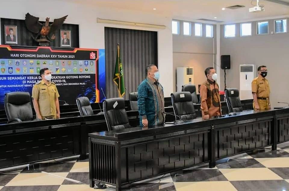 Baskomnews – Pemerintah Kabupaten (Pemkab) Karawang yang diwakili Wakil Bupati H. Aep Syaepuloh dan Sekda H. Acep Jamhuri mengikuti rapat internal dan terbatas puncak peringatan Hari Otonomi Daerah ke-25 secara virtual di Aula Lantai 3 Gedung Singaperbangsa Kantor Bupati Karawang, Senin (26/4/2021) siang.