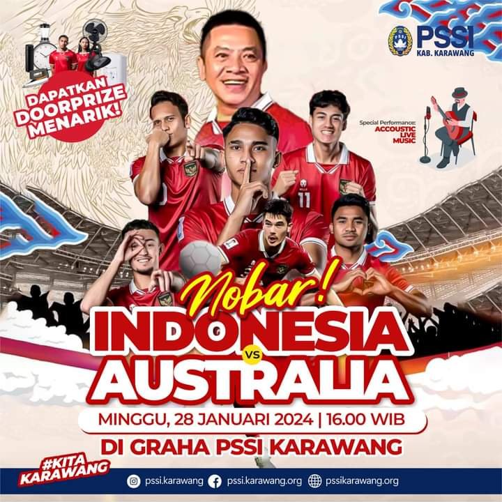 “Kita akan menggelar nobar Pertandingan babak 16 besar piala Asia Indonesia vs Australia, pada tanggal 28 Januari 2024, hari Minggu pukul 16:00 WIB. Dan acara nobar juga akan dihadiri langsung oleh pak Bupati Karawang, H. Aep Syaepulloh SE, terlebih untuk semakin memeriahkan acara pun telah disiapkan juga berbagai macam doorprize menarik,” ungkapnya.